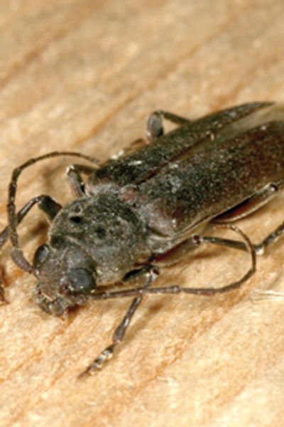 Burnt pine longicorn beetles lay their eggs into pine and spruce trees where their larvae bore into the timber. This species is found in Europe, North Africa and New Zealand, and can fly aboard or can be brought in with cargo. Burnt pine longicorn beetles shelter in crevices during daylight hours. They are active and attracted to lights on summer nights, generally between November and March. Adults can be between 1 cm and 3 cm in length, are dark brown and have long antennae.
